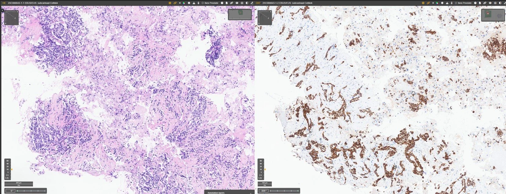 Deze stalen worden steeds onderzocht dmv een dunnelaag preparaat en celblok. Een dunnelaag preparaat ontstaat door het opzuigen van de cellen en deze in een 1 dimensionele laag op een glaasje te plaatsen zodat duizenden cellen optimaal kunnen beoordeeld worden. Een celblok preparaat ontstaat wanneer de celsuspensie als een paraffine blok wordt doorgewerkt waardoor er ook bijkomende technieken mogelijk zijn.